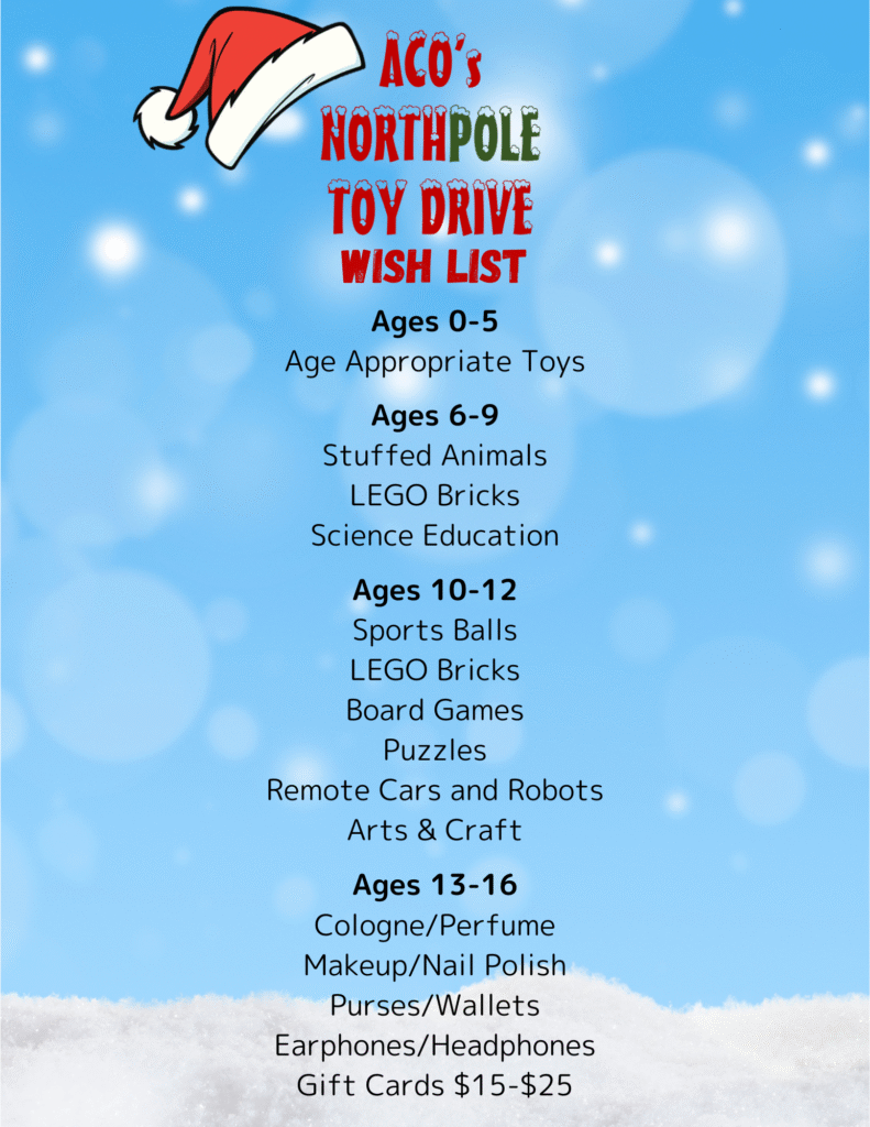 ACO’s North Pole Toy Drive is here! We are expecting to serve over 1,000 kids with toys for the holidays. This could not be possible without generous donations of new, unwrapped toys/gifts for ages 0-16.