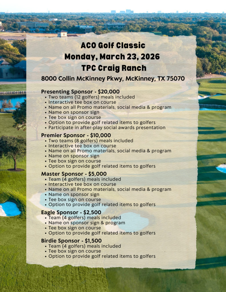 This is a popular tournament and sells out quickly – register now online or mail a check to secure your spot! Make your check payable to All Community Outreach and mail it to 801 E Main St, Allen, TX 75002. Questions? Contact Rhonda Ptak at rptak@acocares.org or call 972-727-9131.