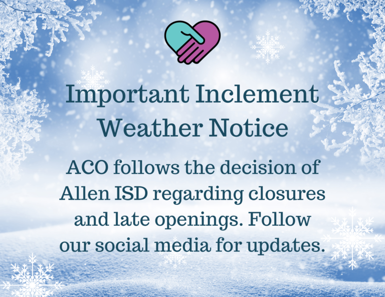 We’re closely monitoring the incoming winter storm and how it may impact our operations. As a reminder, ACO follows the decision of Allen ISD regarding closures and late openings. Please check back on our page over the next few days for the latest updates and any potential closure information. Stay warm and safe!